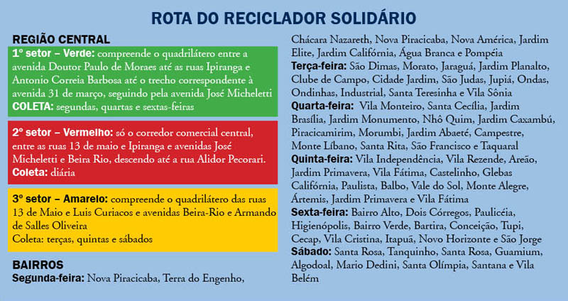 A área central da cidade (veja o quadro) já possui, há mais de dois meses, uma coleta expandida, com o Reciclador Solidário fazendo o recolhimento três vezes por semana; nos bairros, a equipe faz uma visita semanal.